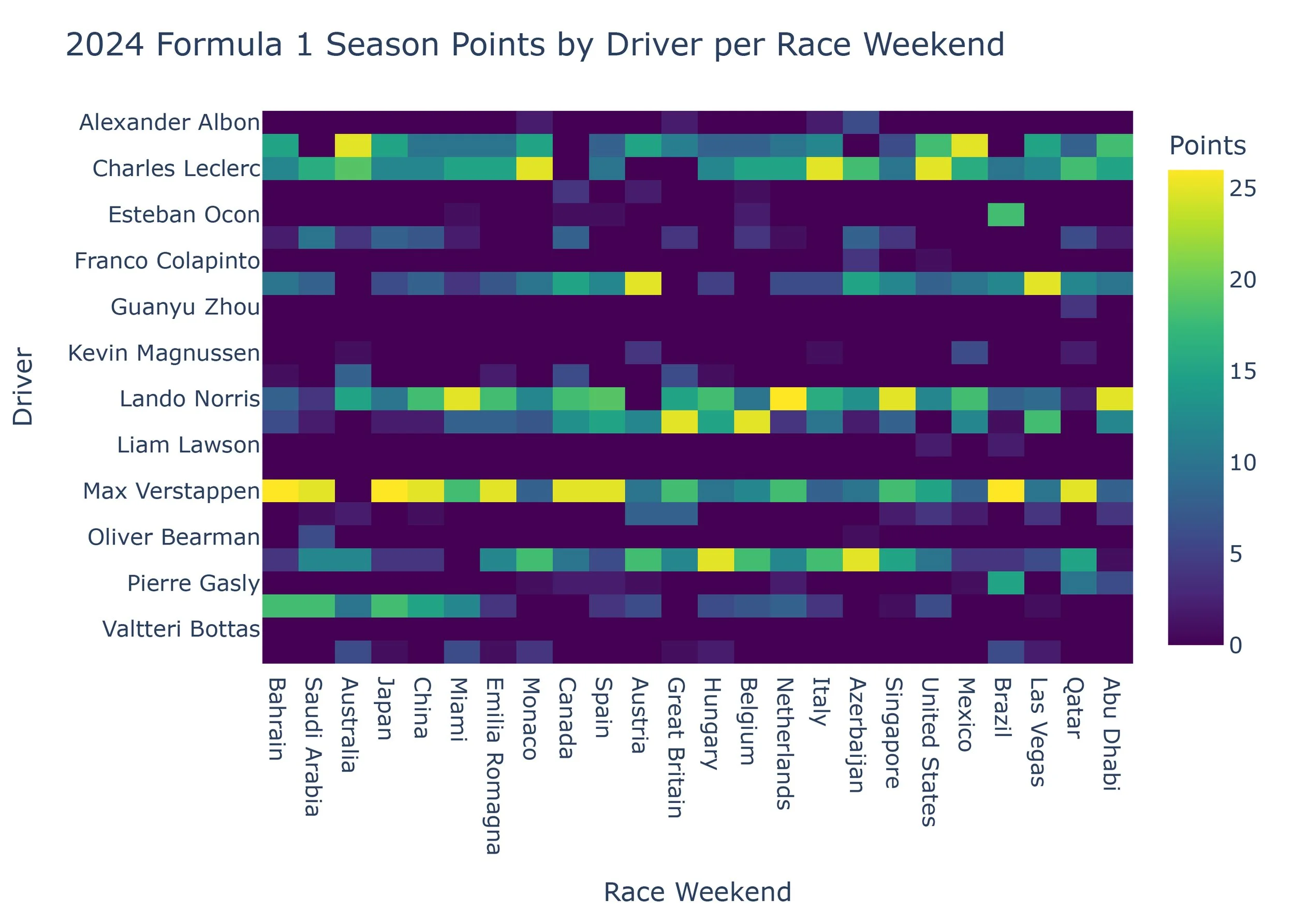 2024 F1 Season Driver Points per Round Heat Map Dec 22 Written By Harry Yu An heat map inforgraphic made for an assignment in SC103N, a Penn State undergraduate course. Data for the infographic comes from f1.com. Harry Yu